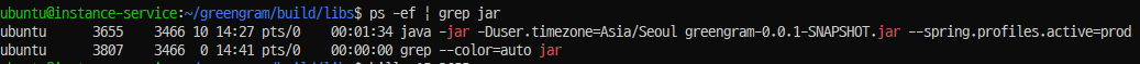$ nohup java -jar -Duser.timezone=Asia/Seoul /home/greengram/build/lib/app.jar --spring.profiles.active=prod > app.log 2>&1 &