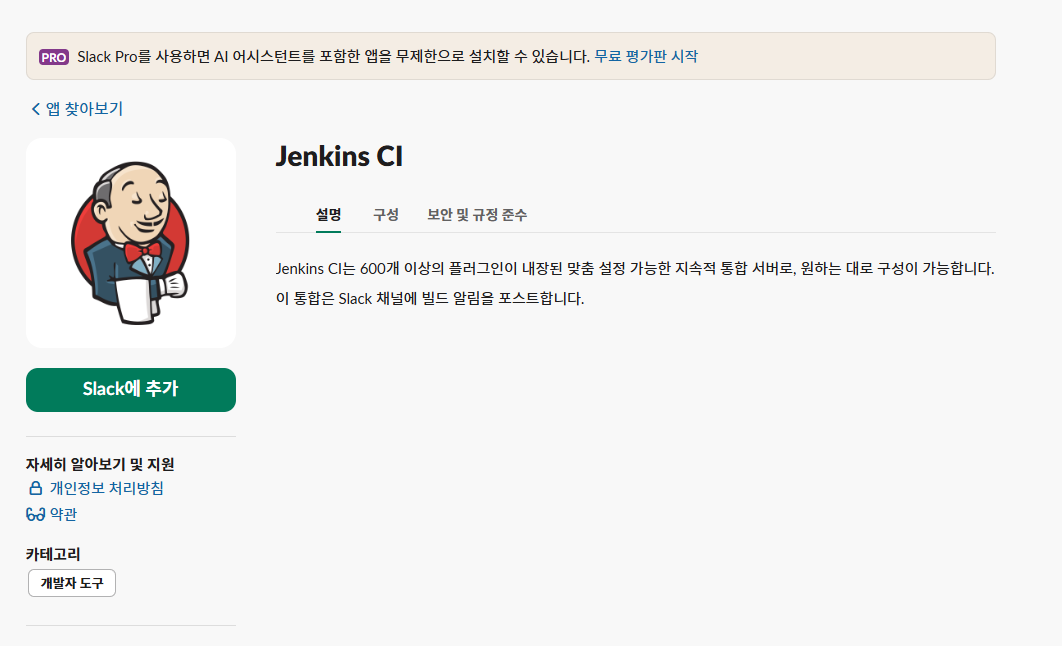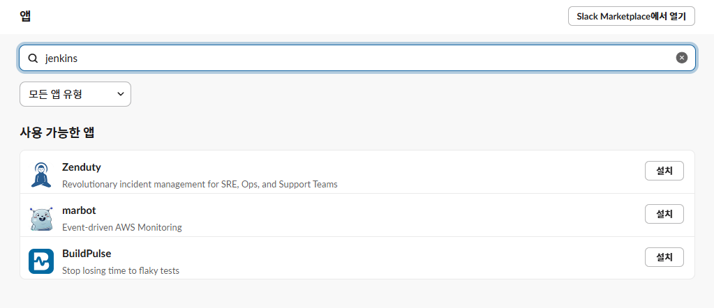 두번째 좌측 사이드 메뉴 중 [ 앱 ] 버튼을 클릭하고 검색 창에서 "Jenkins CI"를 검색하면 검색 결과에 나타나고 검색박스 우측에 있는 [ 설치 ] 버튼을 클릭한다.