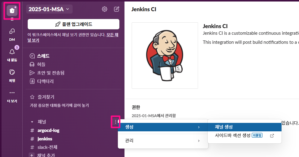 좌측 사이드 메뉴 [ 홈 ] > 두번째 좌측 사이드 화면 중 채널 박스를 찾고 [ 케밥 메뉴 아이콘 ] 을 클릭하면 드롭 다운 메뉴가 나타난다. [ 생성 ] > [ 채널 생성 ] 을 클릭한다.