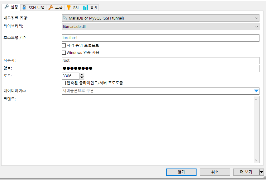 네트워크 유형: MariaDB or MySQL (SSH tunnel)