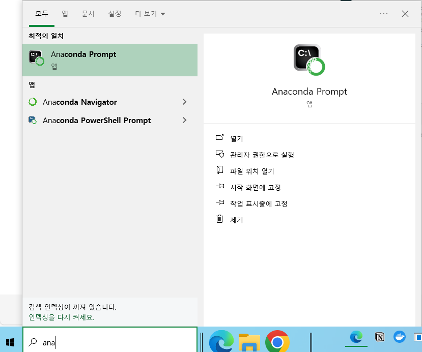 작업 표시줄 검색창에서 'anaconda'를 입력하면 Anaconda Prompt 앱이 표시된다. 실행하자.