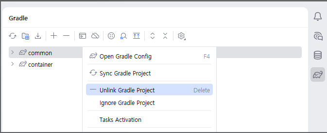 gradle Sync All(코끼리 아이콘 클릭)을 하면 Gradle창에 container 아래에 common이 나타난다.