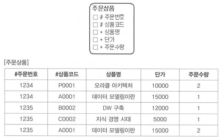 그림(2) 릴레이션에서 일반 속성인 상품명과 단가는 복합키(주문번호, 상품코드)에 종속되지 않고 상품코드에만 종속되는 부분 함수 종속이다.