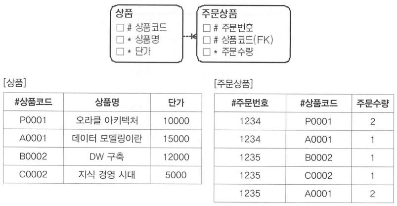 그림(2) 릴레이션에서 일반 속성인 상품명과 단가는 복합키(주문번호, 상품코드)에 종속되지 않고 상품코드에만 종속되는 부분 함수 종속이다.
