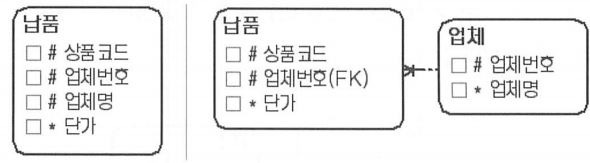 그림(6) 왼쪽 모델이 업체번호 속성이 업체명 속성을 종속하므로 오른쪽 모델과 같이 정규화를 해야 한다.
