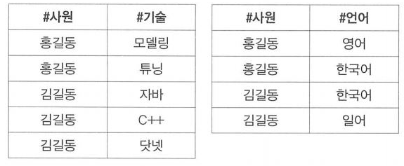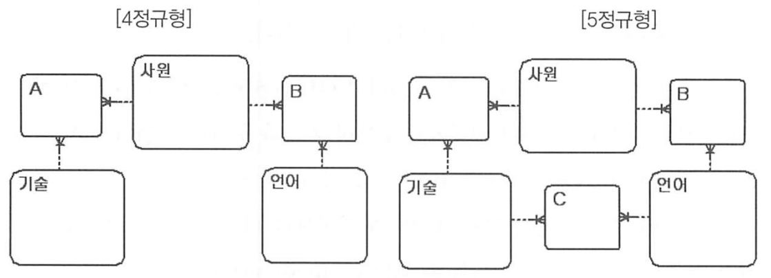그림(4)에서 보는 것처럼 제4정규형과 제5정규형은 비슷하다. [4정규형]에서 A, B가 엔터티이고 [5정규형]에서 A, B, C가 엔터티이다. [4정규형]은 기술과 언어의 연관되지 않지만 [5정규형]은 기술과 언어가 연관 관계가 존재하므로 C엔터티가 필요하다. 그림(2) 릴레이션처럼 되는 것이다.