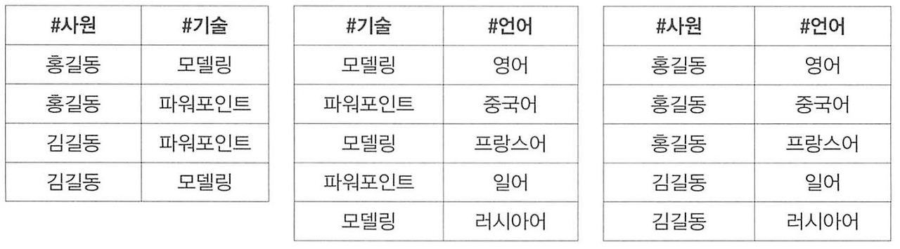 그림(1)은 조인 종속이 존재하는 릴레이션이다. 제4정규형을 설명할 때 제4정규형 그림(1) [릴레이션1]과 유사하지만 차이점이 있다. 제4정규형은 기술과 언어 속성이 독립적이었지만 그림(1) 은 연관성이 있다는 점이다. 사원과 기술, 언어 속성이 관계가 있다는 업무 요건이 존재한다.
