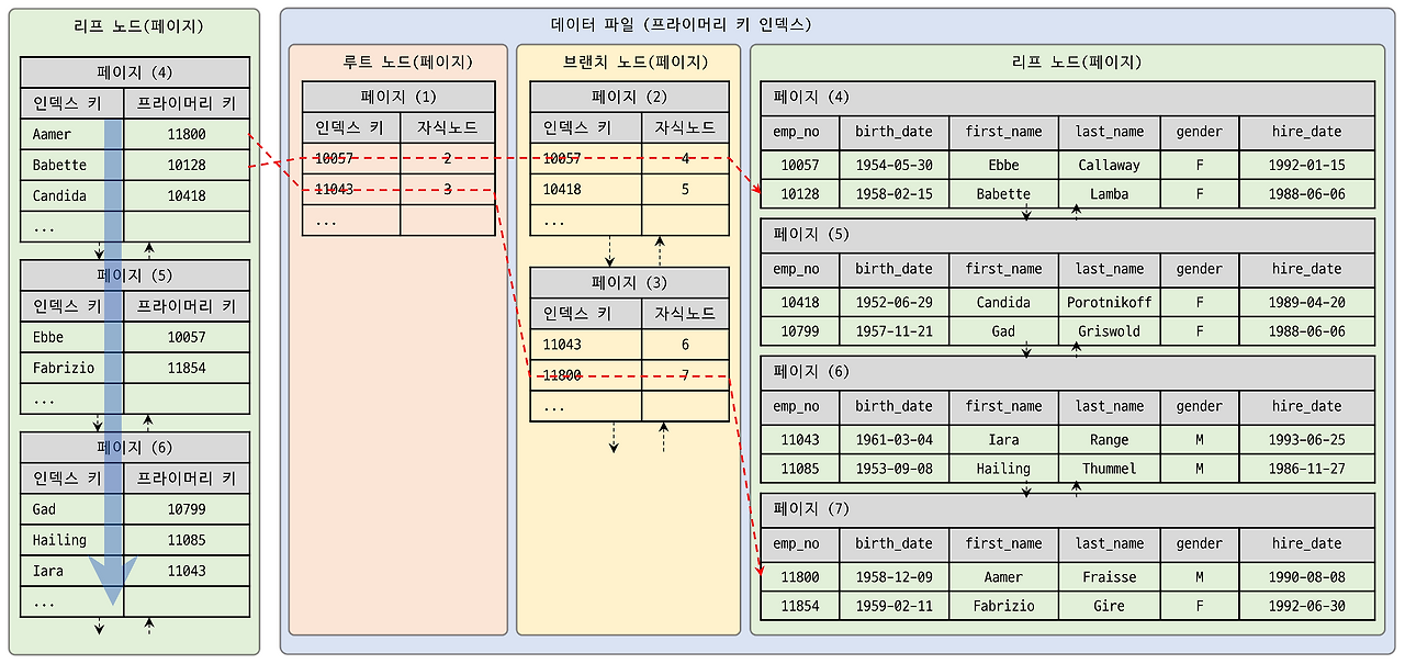 인덱스 키 Babette를 찾으려고 할 때 프라이머리 키값이 10128인 것을 인덱스 리프 노드(가장 왼쪽)에서 확인을 하였다. 데이터 파일 루트 노드(분홍색)에서 인덱스 키값 11043은 10128보다 큰 값이기 때문에 인덱스 키 10057의 자식 노드 2를 확인하였다. 데이터 파일 브랜치 노드 (노란색)에서 2번 페이지를 찾았고 인덱스 키값 10418은 10128보다 큰 값이기 때문에 인덱스 키 10057의 자식 노드 4를 확인하였다. 데이터 파일 리프 노드(가장 오른쪽)에서 4번 페이지를 찾았고 4번 페이지에서 PK값이 10128을 찾았다.