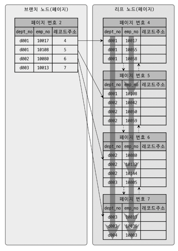그림(1)에서는 편의상 루트 노드는 생략했으나 실제로 데이터 레코드 건수가 작은 경우에는 브랜치 노드가 없는 경우도 있을 수 있다. 하지만 루트 노드와 리프 노드는 항상 존재한다. 다중 칼럼 인덱스에서 중요한 점은 두 번째 컬럼은 첫 번째 컬럼에 의존해서 정렬돼 있다는 것이다. 즉 두번째 컬럼의 정렬은 첫 번째 컬럼이 똑같은 값일 때 의미가 있다는 것이다.