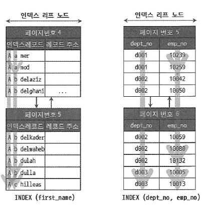 그림(1)에서는 편의상 루트 노드는 생략했으나 실제로 데이터 레코드 건수가 작은 경우에는 브랜치 노드가 없는 경우도 있을 수 있다. 하지만 루트 노드와 리프 노드는 항상 존재한다. 다중 칼럼 인덱스에서 중요한 점은 두 번째 컬럼은 첫 번째 컬럼에 의존해서 정렬돼 있다는 것이다. 즉 두번째 컬럼의 정렬은 첫 번째 컬럼이 똑같은 값일 때 의미가 있다는 것이다.
