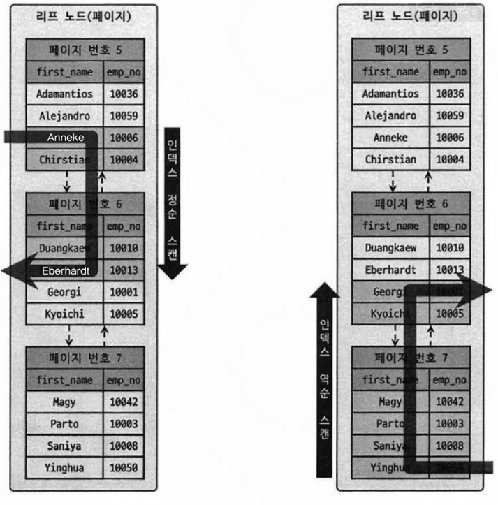 그림(2)는 인덱스를 정순으로 읽는 경우와 역순으로 읽는 경우를 보여준다. 즉, 인덱스 생성 시점에 오름차순 또는 내림차순으로 정렬이 결정되지만 쿼리가 그 인덱스를 사용하는 시점에 인덱스를 읽는 방향에 따라 오름차순 또는 내림차순 정렬 효과를 얻을 수 있다. 쿼리의 ORDER BY 처리나 MIN(), MAX() 함수 등의 최적화가 필요한 경우에도 MySQL 옵티마이저는 인덱스의 읽기 방향을 전환해서 사용하도록 실행 계획을 만든다.