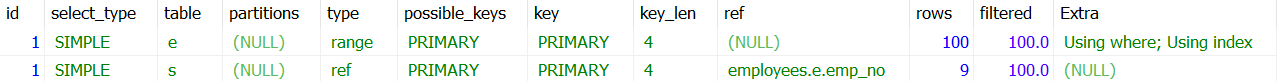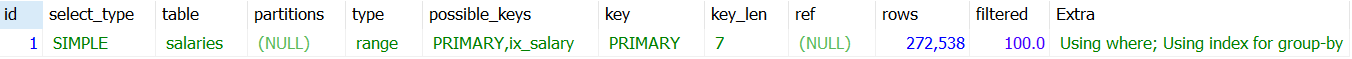 salaries 테이블은 PK (emp_no, from_date), INDEX(salary) 이렇게 2개의 인덱스가 생성되어 있다. 위의 쿼리에서 WHERE 조건은 인덱스 레인지 스캔을 이용할 수 없는 쿼리지만 아래 실행 계획을 살펴보면 인덱스 레인지 스캔을 이용하였고 GROUP BY 처리까지 루스 인덱스 스캔을 사용한 것을 알 수 있다.