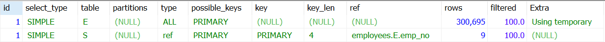 위 실행계획의 쿼리를 보면 내부적으로 "COUNT(DISTINCT s.salary)"를 처리하기 위해 임시 테이블을 사용할 수 밖에 없다. 하지만 지금까지 모든 MySQL 버전에서 이와같은 실행계획에서 임시 테이블을 사용한다는 "Using temporary" 메시지를 Extra 컬럼에 표시하지는 않았다. 특이한 경우라도 생각된다.