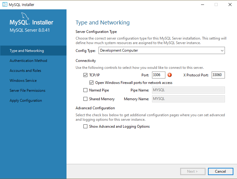 Open Firewall port for network access: 외부에서 접근할 수 있도록 방화벽에서 포트를 허용. 개발 컴퓨터에서는 체크해도