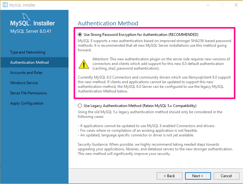 MySQL 8.0 버전에서는 사용자의 비밀번호 저장 암호화 방식이 강력해졌다. 강력한 방식의 비밀번호를 선택(기본)하고 "Next >" 버튼을 클릭
