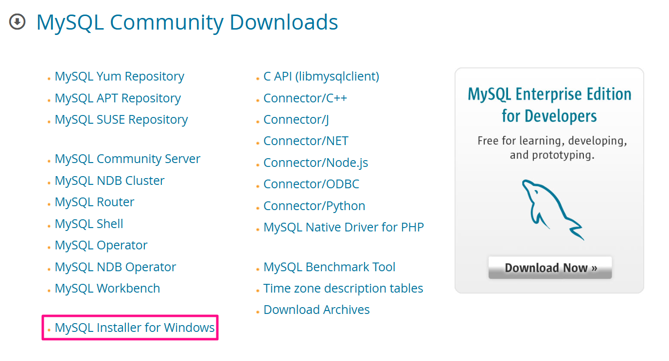 위 화면이 나타나면 "MySQL Installer for Windows" 링크를 클릭한다.