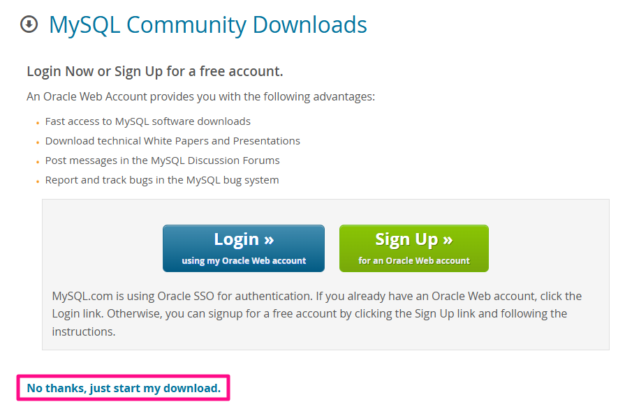 오라클 사이트에 비로그인 상태면 위와 같은 화면이 나타난다. 로그인을 진행하거나 "No thanks, just start my download." 링크를 클릭하여 설치 파일을 내려받자.