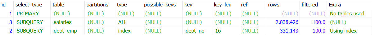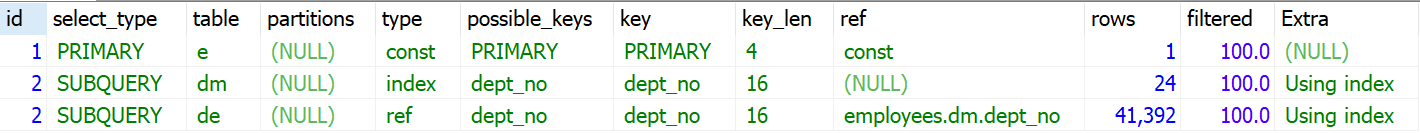 위 쿼리는 서브쿼리의 내용을 임시 테이블로 구체화(Materialization)한 후 임시 테이블과 employees 테이블을 조인하는 형태로 최적화된다. 위 실행계획에서 두 번째 레코드 table 컬럼의 값인 "<subquery2>"는 id값 2번의 결과를 employees 테이블과 조인을 했다는 의미이다.