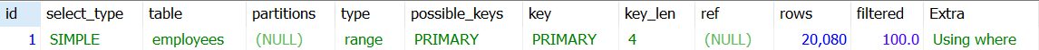 UNION이나 서브쿼리를 사용하지 않는 단순한 SELECT 쿼리인 경우 select_type은 SIMPLE로 표시된다. 쿼리에 조인이 포함된 경우에도 마찬가지다. 아무리 복잡한 쿼리라도 SIMPLE인 단위 쿼리는 하나만 존재하며 여러 레코드라면 id값이 같다.