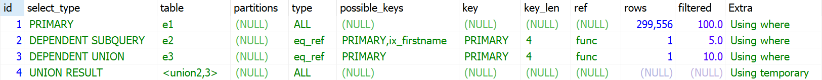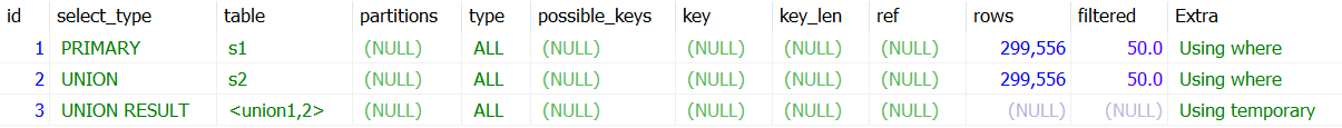 UNION 및 UNION ALL으로 결합하는 단위 SELECT 쿼리 가운데 첫 번째를 제외한 두 번째 이후 단위 SELECT 쿼리의 select_type은 UNION으로 표시된다. MySQL 8.0 이전 버전에서는 UNION ALL 경우도 임시테이블을 사용하였지만 8.0 버전에서는 임시 테이블을 사용하지 않도록 개선됐다.