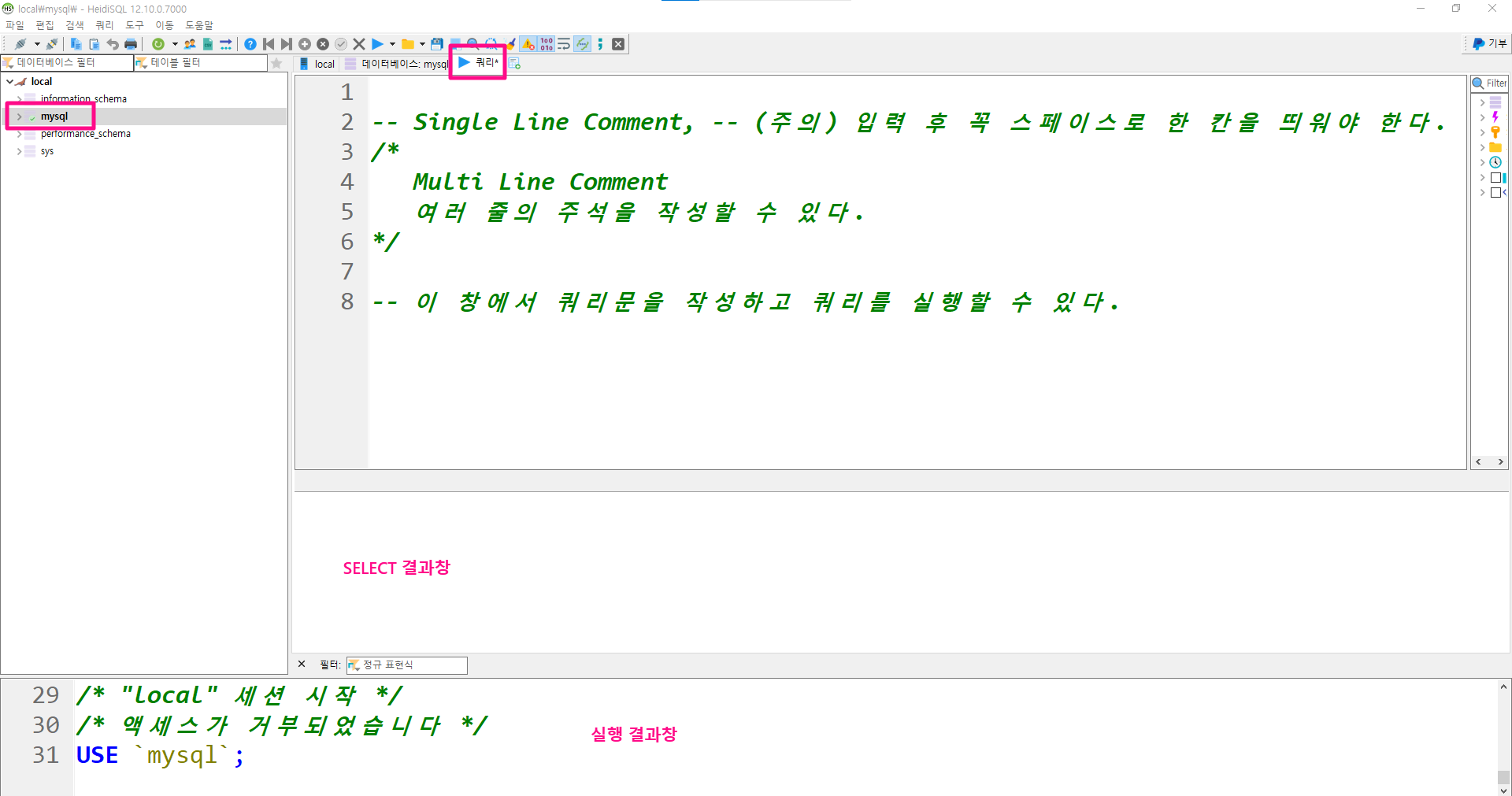 쿼리창에서 주석 및 쿼리를 작성할 수 있다.