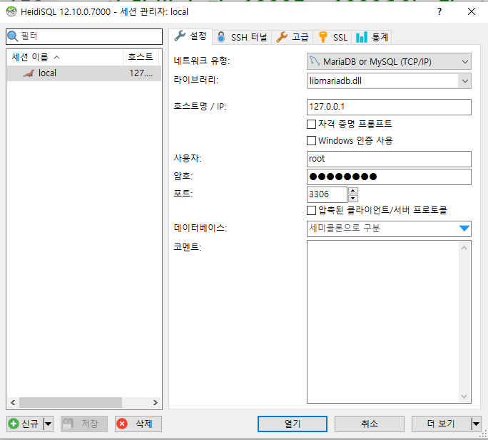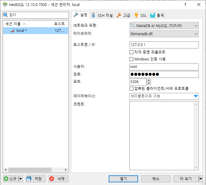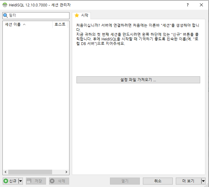 HeidiSQL을 실행하면 첫화면 세션 관리자이다. 접속 정보를 저장할 수 있는 화면으로 생각하면 된다.