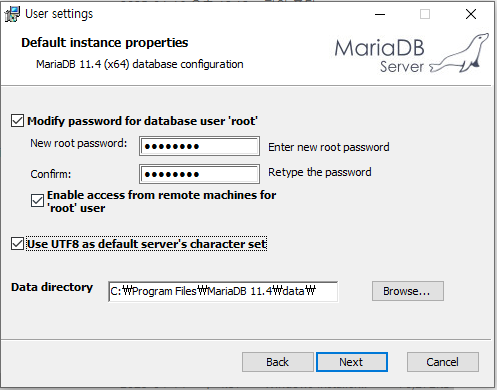 Use UTF8 as default server's character set: 반드시 체크. 문자 인코딩 방식을 UTF8로 세팅