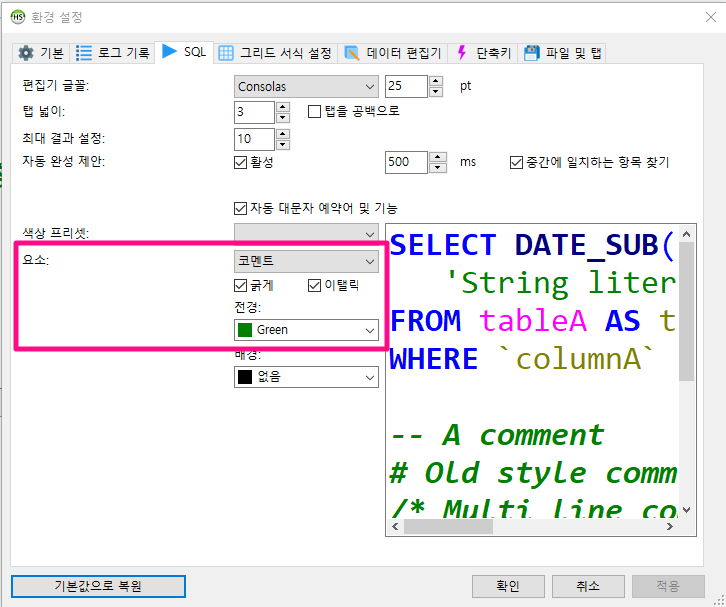도구 > 환경설정, SQL 탭에서 빨간색 박스 부분을 원하는 내용을 변경 후 [확인]을 클릭