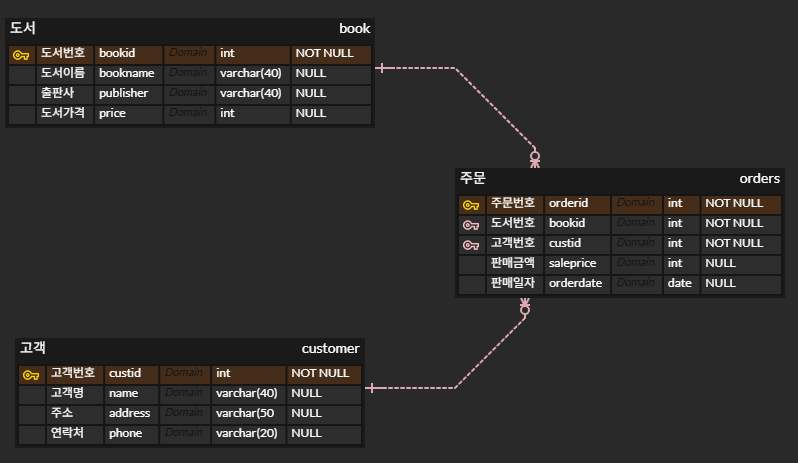 N:M 한 고객은 여러권의 책을 살 수 있고 다른 고객이 산 책도 살 수 있다.