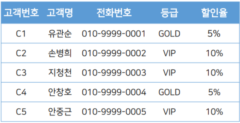 고객( 고객번호, 고객명, 전화번호, 등급 )
