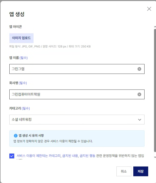 앱 이름: (필수사항) 희망하는 애플리케이션 이름을 입력한다.