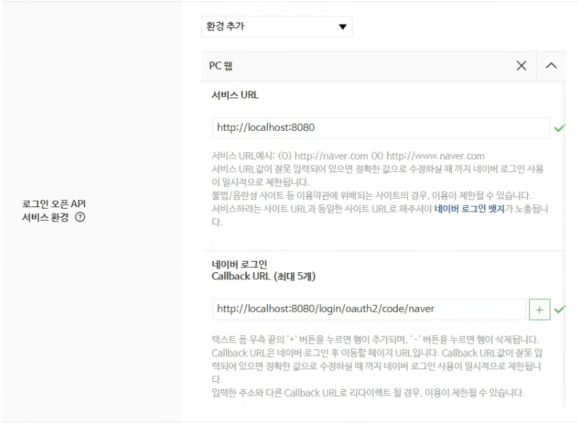 네이버 로그인 Callback URL: ${백엔드 접속 URL}/login/oauth2/code/naver 를 입력한다. (여러개 입력 가능)