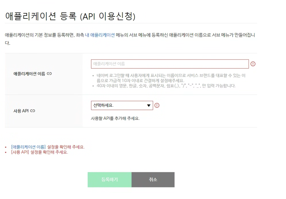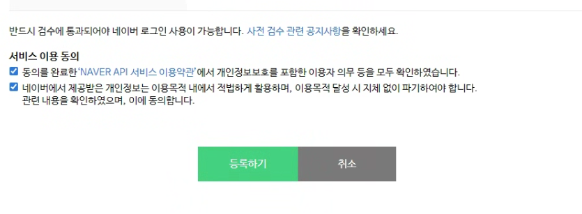 모두 선택 및 입력 후 아래 동의에 모두 체크하고 [등록하기] 버튼으로 애플리케이션을 등록한다.