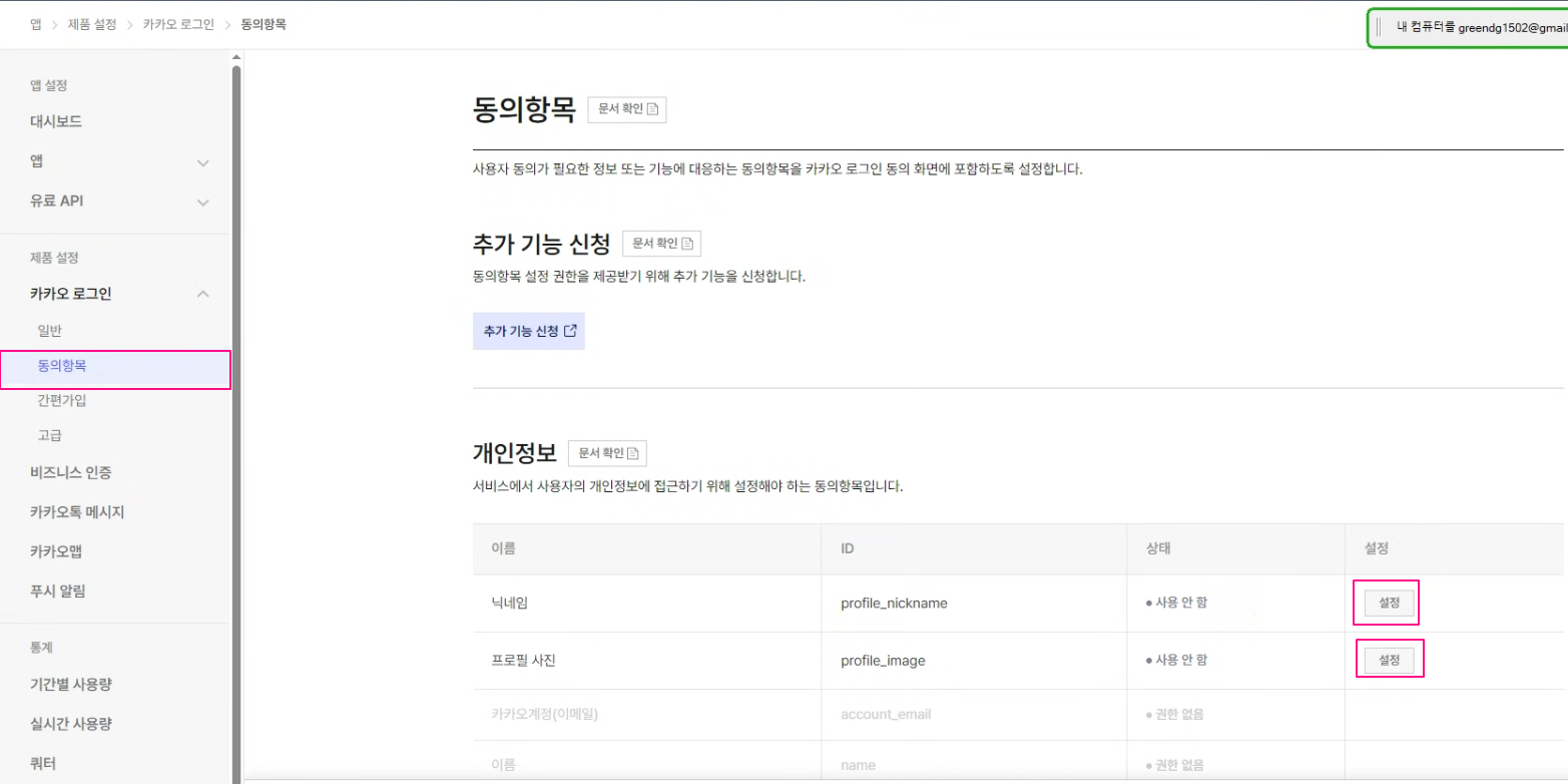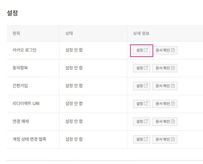 화면에서 스크롤을 아래로 내리면 설정 박스가 나타난다. [카카오 로그인] - [설정] 버튼을 클릭한다.