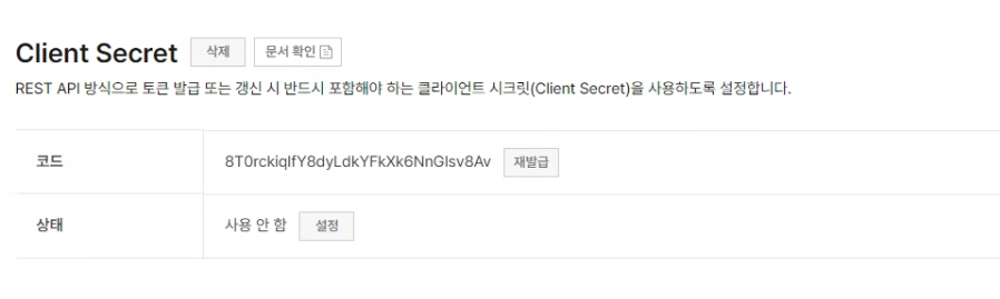 아래 화면처럼 클라이언트 시크릿이 표시된다. [상태] - [설정]을 클릭한다. Client Secret값을 구할 수 있다.