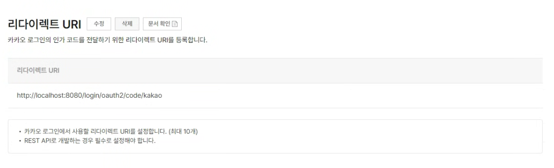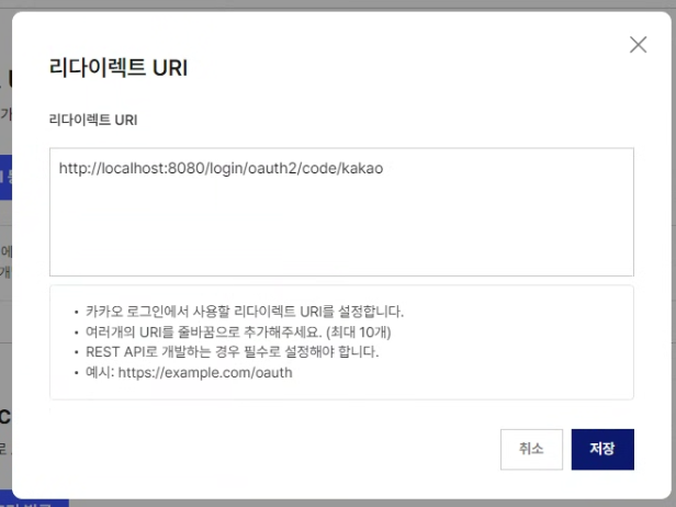 리다이렉트 URI: ${백엔드 접속 URL}/login/oauth2/code/kakao 를 입력한다. (여러개 입력 가능)