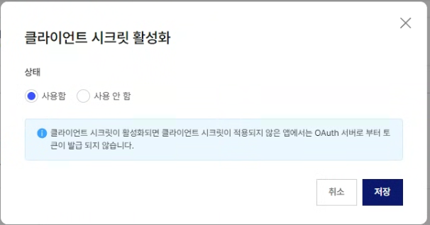 모달 창이 나타난다. 상태를 '사용함'을 선택하고 저장한다.