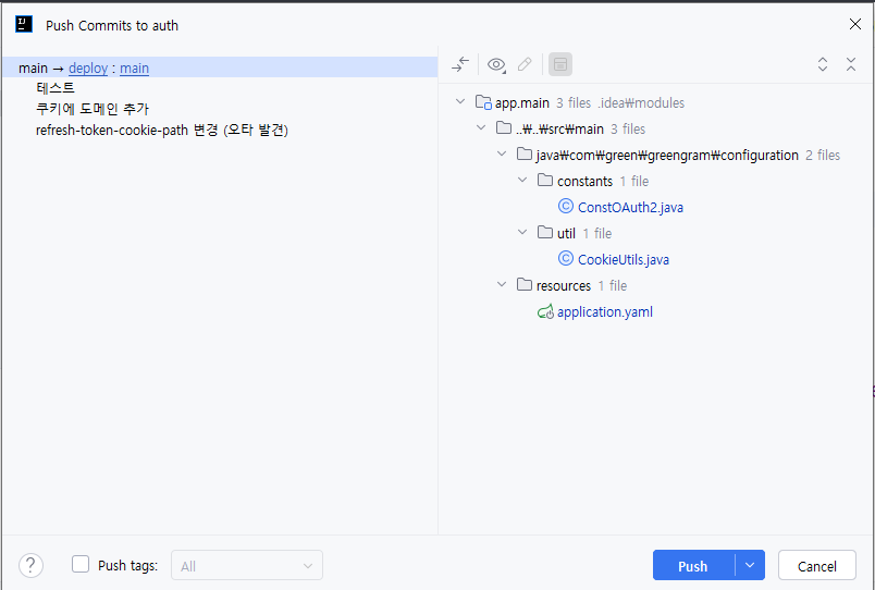 deploy에 push를 하고 싶을 때, (IntelliJ 메뉴) Git > Push 선택