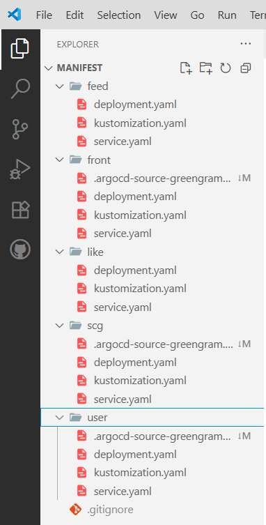 각 Application 전용 폴더를 생성한다. 각 폴더 아래에 deployment.yaml, kustomization.yaml, service.yaml 파일을 생성한다.