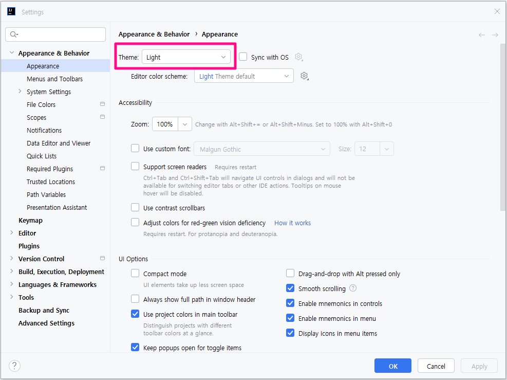 Light 테마를 추천. Dark 모드처럼 배경이 어두운 테마가 근, 난시를 유발할 수 있다는 최근 연구결과가 있었음.