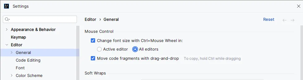 Mouse Control 박스에 있는 “Change font size with Ctrl+Mouse Wheel in:”에 체크