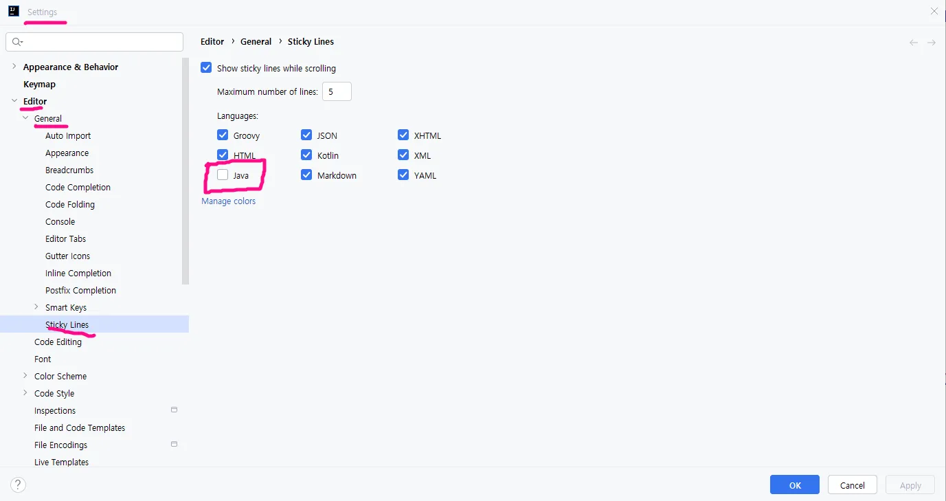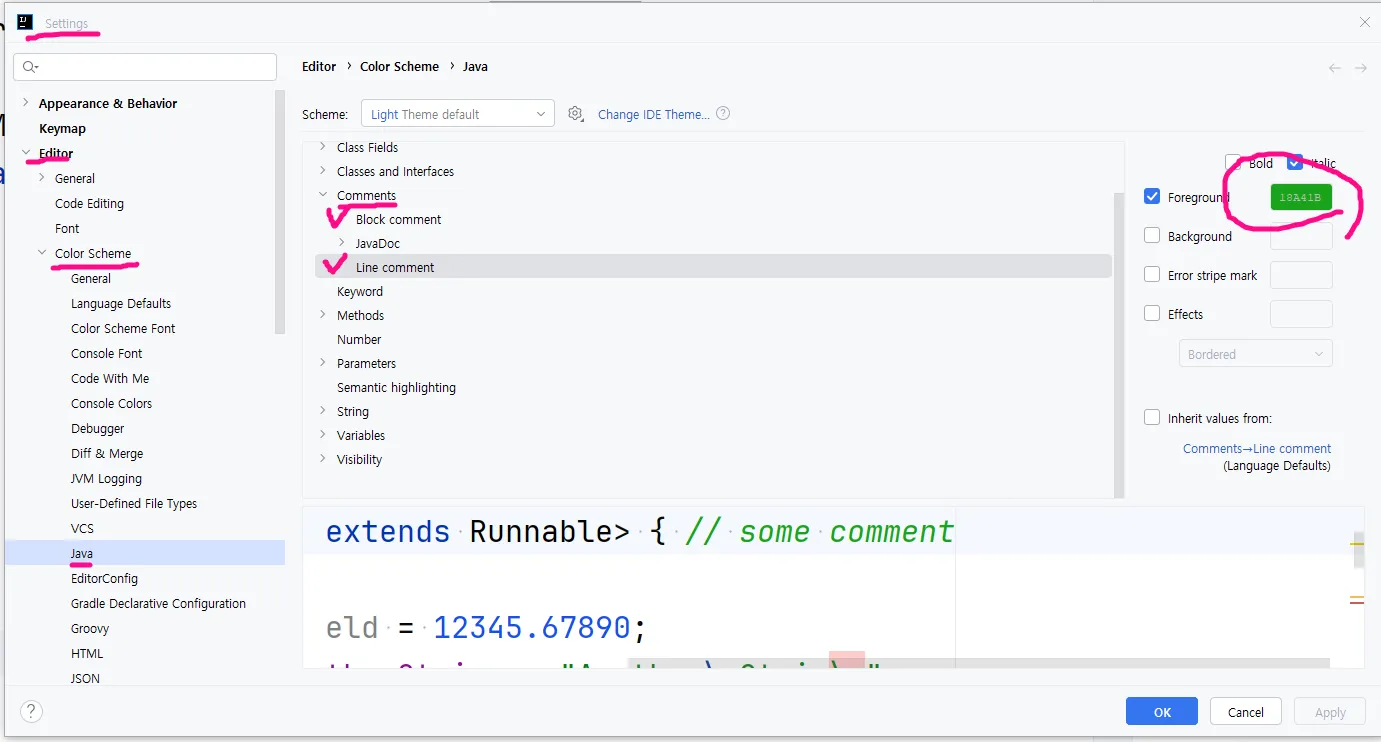 화면에서 Comments 선택. Block comment, Line comment 모두 Inherit values from: 체크 해제 후 Foreground 를 원하는 16진수 색상값으로 변경하면 됨. (아래 화면의 색상값: 10A41B)